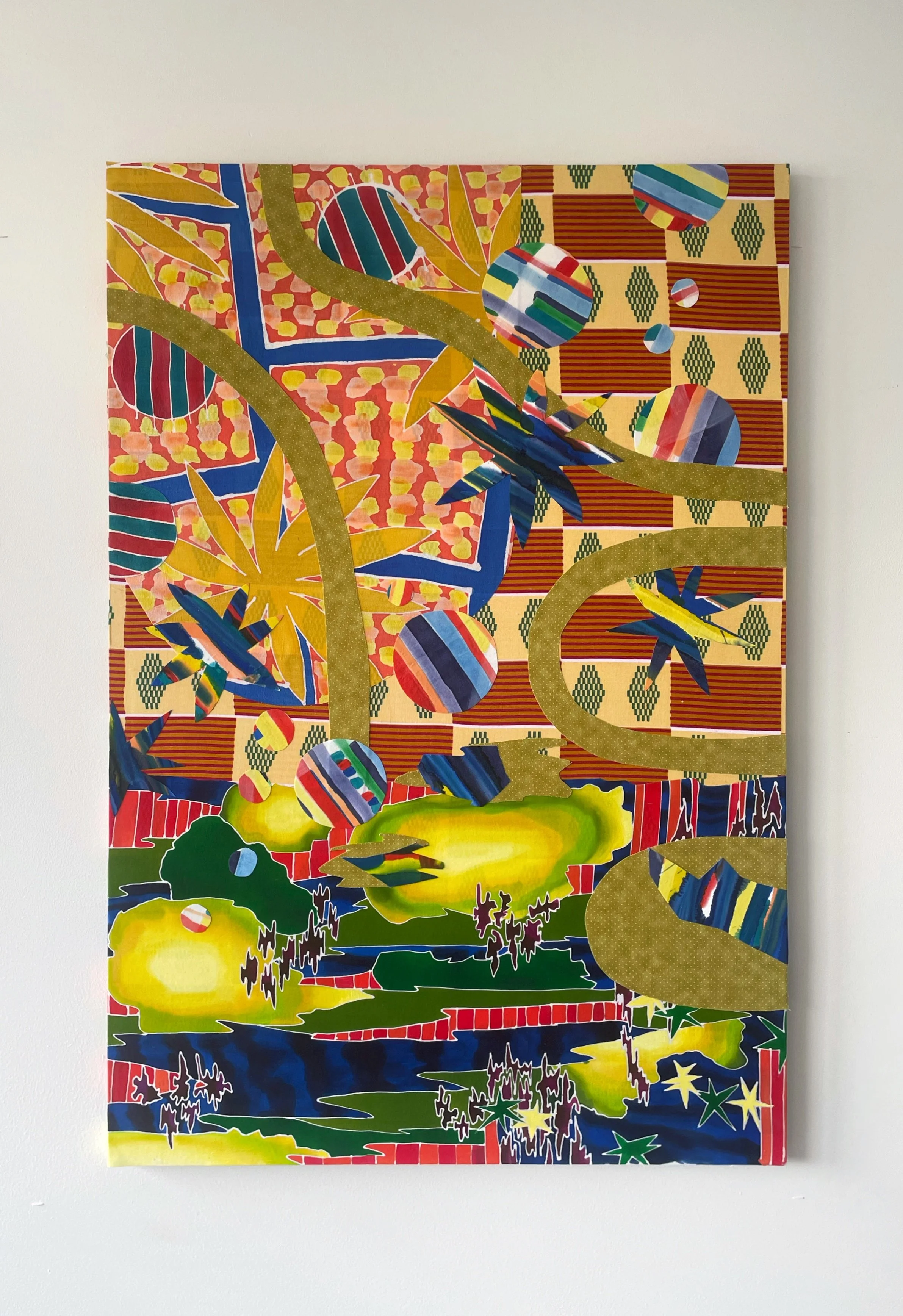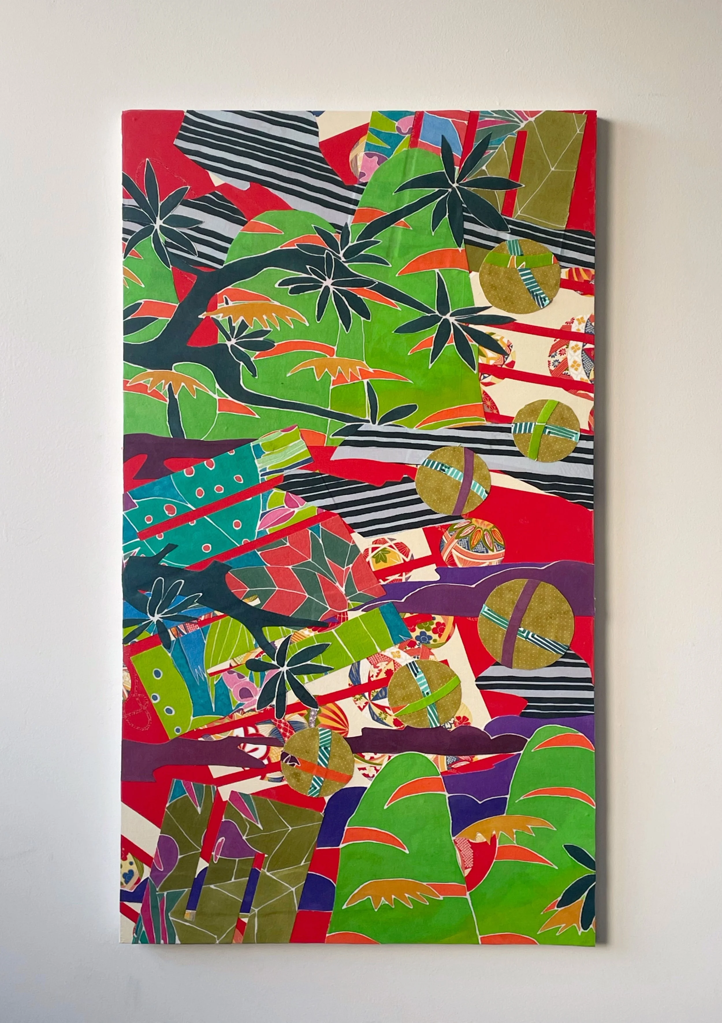 These compositions combine fragments of printed patterns from my fabric libraries with remnants of silk paintings taken from scarves or experimental works. Bright colors and organic shapes construct hybrid landscapes, between abstraction and figuration.